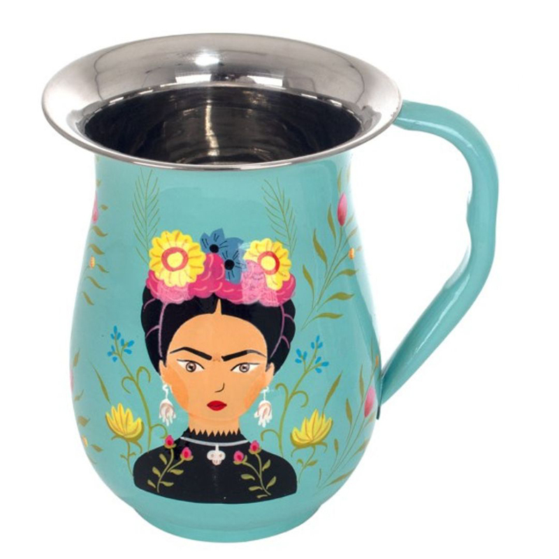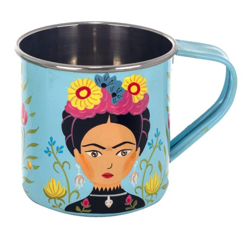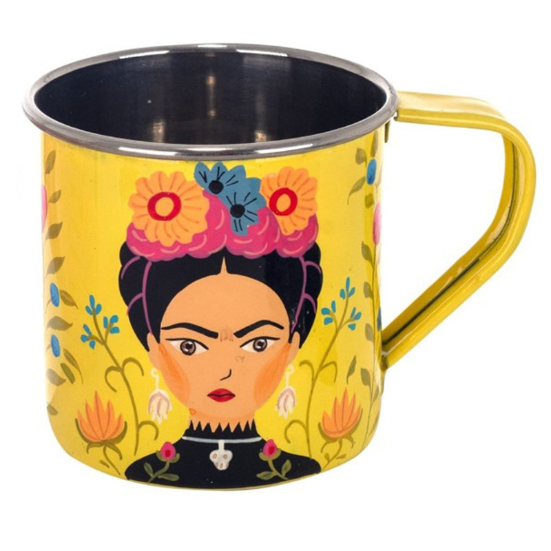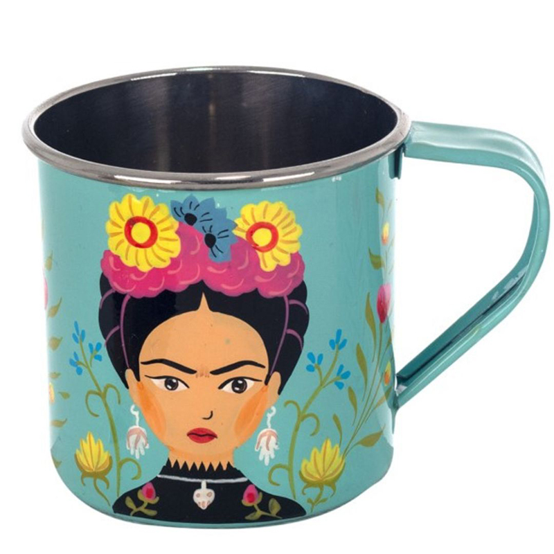 Taza metálica esmaltada pintada a mano con imagen de Frida Khalo. Apta para uso doméstico, no apto para microondas o lavavajillas.